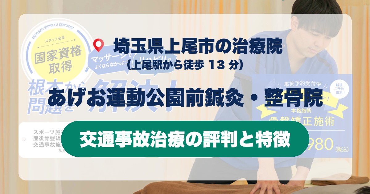 あげお運動公園前鍼灸・整骨院は上尾から徒歩13分にある通いやすい接骨院です。交通事故後のむち打ちや体の不調に対応しており、口コミでも通いやすさが評価されています。実際の特徴や評判をまとめましたので、通院先を検討している方はぜひ参考にしてください。