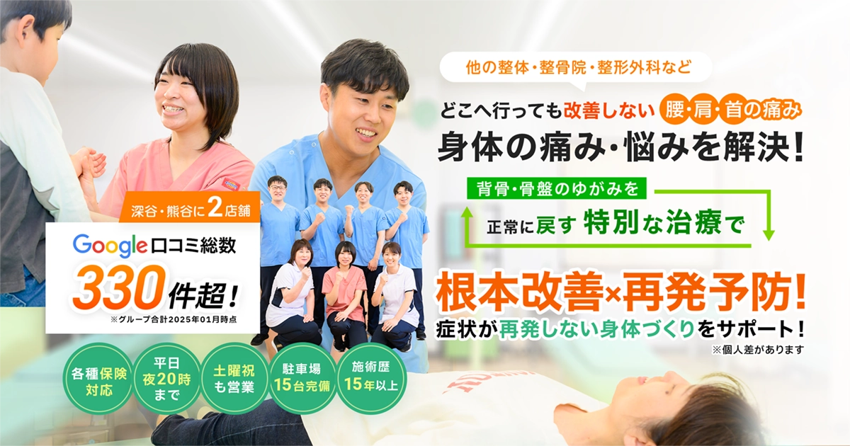 - 深谷たいよう接骨院・整体院は、交通事故治療や多様な身体の不調に対して専門的な施術を行う施設です。特に産後の骨盤調整や慢性的な痛みの改善に力を入れており、患者からの評価も高いです。明るく親しみやすい雰囲気の中で、リラックスして施術を受けられる環境が整っています。