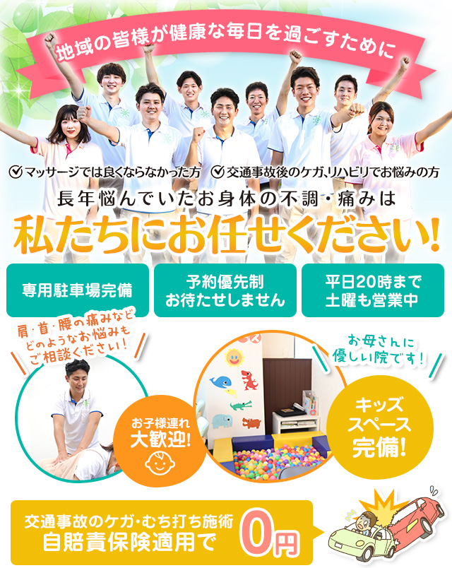- たいよう整骨院 川口朝日院は、交通事故治療を含む幅広い施術を提供している整骨院です。多くの口コミでは、スタッフの若さや親しみやすさが評価されており、患者に対する丁寧な対応が印象的です。特に、交通事故後の治療に関しては、個々の症状に応じたマッサージや自宅でのケア方法を教えてくれる点が高く評価されています。また、出産後の骨盤調整や、子どもを預けられるサービスも好評で、安心して通える環境が整っています。さらに、治療の効果を実感している患者が多く、特に首や膝の痛みの改善に関する声が多く寄せられています。全体として、たいよう整骨院 川口朝日院は、患者のニーズに応じた柔軟な対応と高い技術力を持つ整骨院として、多くの人々に支持されています。